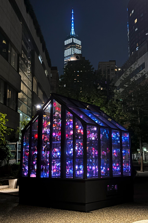 Over 150 members of the public made paper flowers in a series of workshops in lower Manhattan. These were waxed, lit with LED lights, and installed in a greenhouse with two-way mirrored windows. The glazing gradually revealed the interior as the sun set.