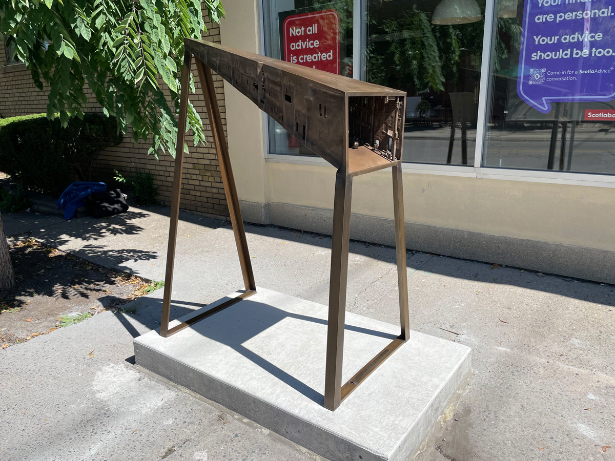 Capturing the constellations overhead, the bronze wedge viewing device invigorates a sculptural still, in the form of a bronze tourist marker. As the city changes around it, the streetscape inside the sculpture will remain still.