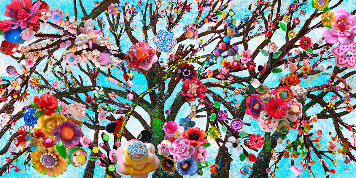 This digitally produced mural is the result of two drop-in workshops. Over 60 participants of all ages and skill levels sculpted and decorated branches out of chocolate and assorted candies. These were then photographed and collaged digitally.