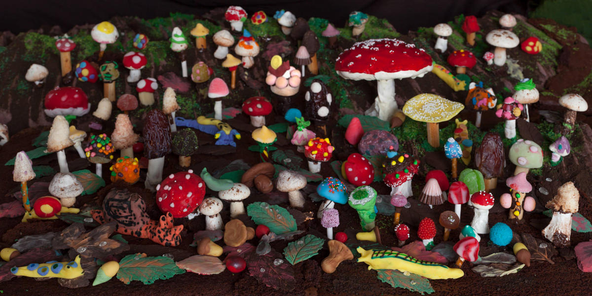 This digitally produced mural is the result of two drop-in workshops. Over 60 participants of all ages and skill levels sculpted and decorated mushrooms, leaves, snails, and slugs out of chocolate, marzipan, and assorted candies. These were then photographed as a single image.