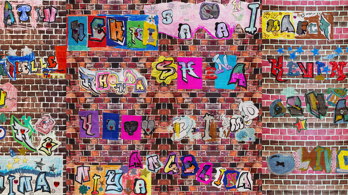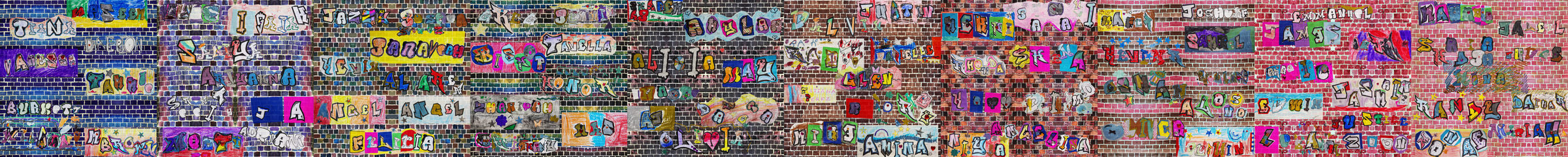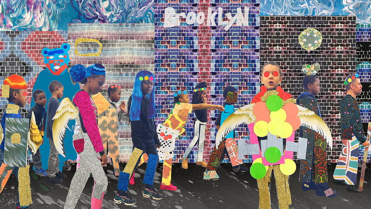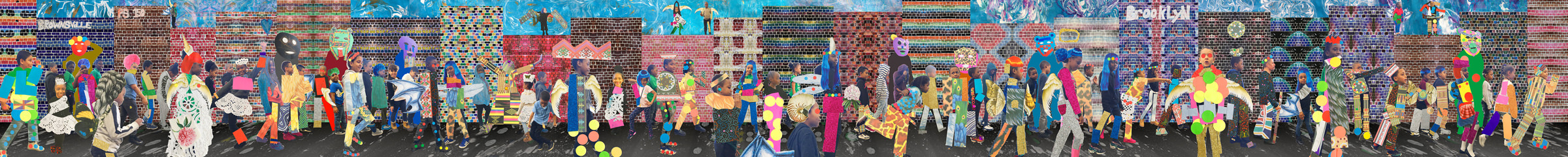Over the course of Rhonda’s ProjectArt residency in Brownsville, Brooklyn in 2018–19, the 85 kids in the program made a number of projects which were digitally combined to create a one foot by ten foot long photo mural. Each participant was photographed in a pose mimicking walking in a parade. These were edited and printed, and the kids then added ‘costumes’ to their portraits by using various collage materials. The costumed portraits were then rephotographed. The cityscape behind the parade reflected their neighborhood environment and was composed of other things the kids had made: watercolor brick patterns, marbleized paper ‘skies’, and toothbrush splatter-painted ‘streets’.