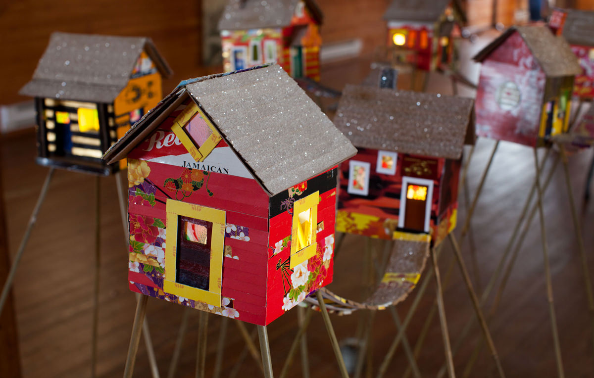 A group of 25 local residents, aged 6 to 60, each constructed a model house based on Steveston’s historic fishermen’s homes, which were raised on stilts in tidal areas. The workshops took place at a historic ship-building complex which has extant examples of these homes. This project was almost entirely made of recycled materials found locally. Participants selected packaging materials and collaged sliced pieces as cladding and details.