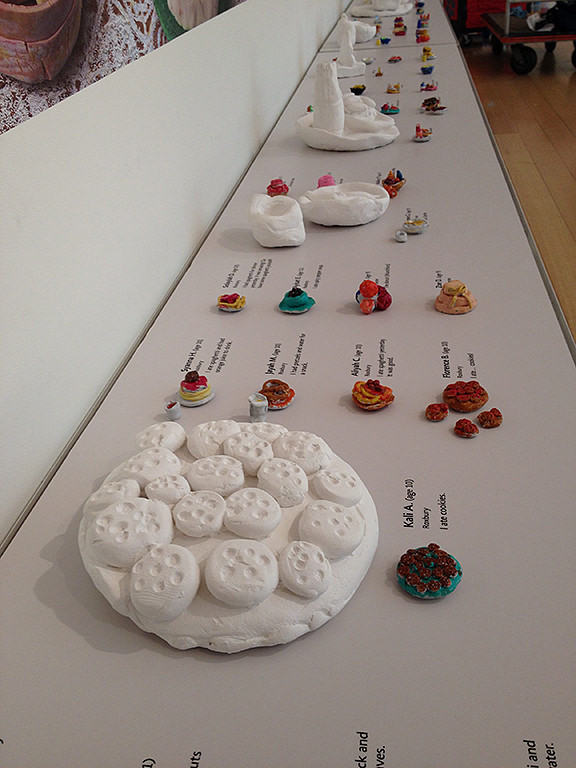 As a counterpoint to the immense photomural Endless Feast, each child made a small sculpture of a meal that they had eaten the day before, some of which have been enlarged to life scale by Weppler.