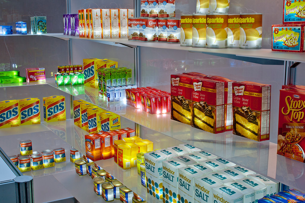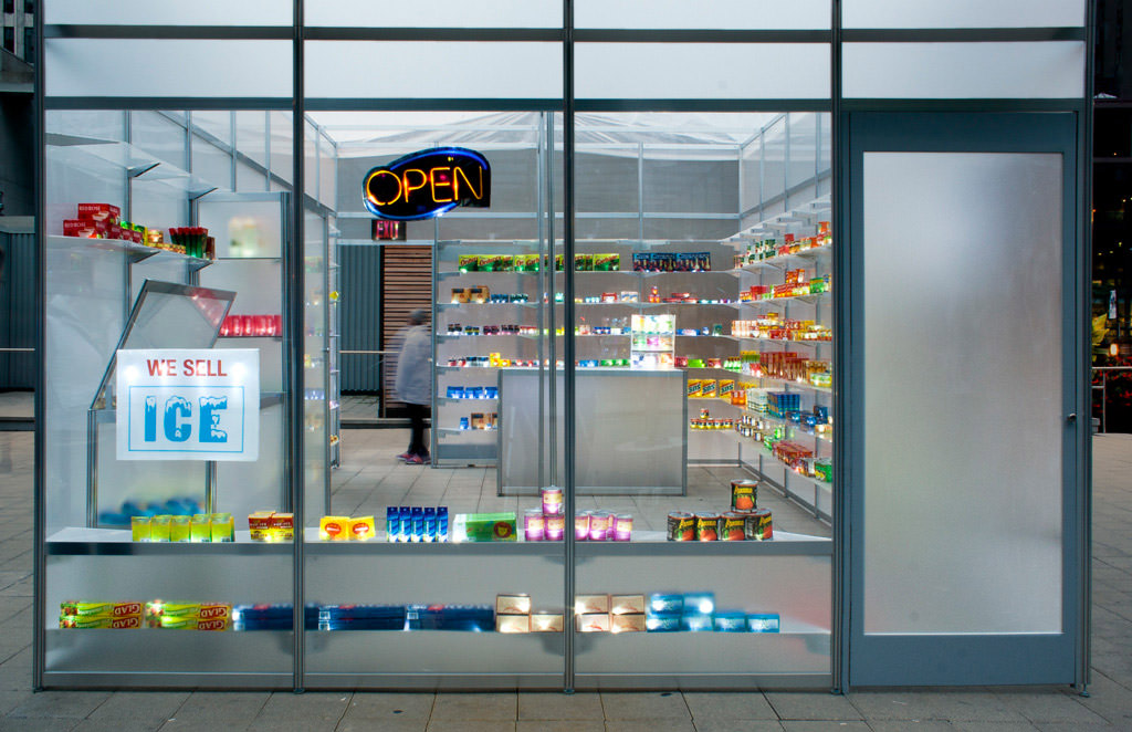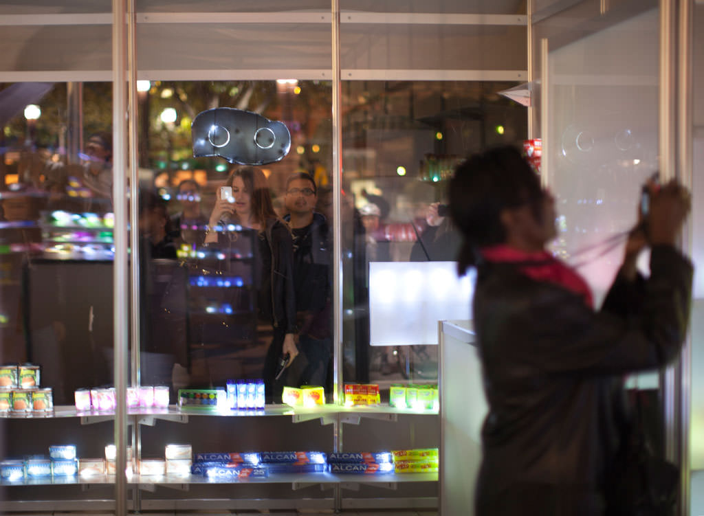 Each product in this representation of a store was a lantern, which were given away to visitors during the 7pm to 7am course of Nuit Blanche, darkening the structure over the course of the night.