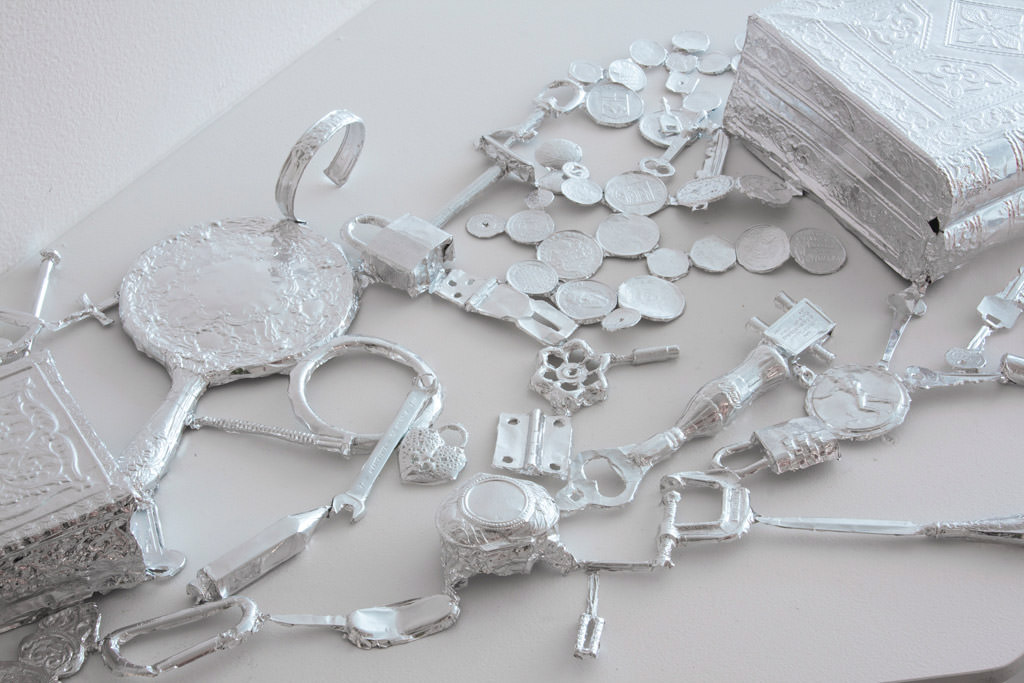 We have collected hundreds of silver-coloured objects, made of materials ranging from plastic to metals such as chrome, silver and pewter. This piece is a record of them, embossed into a single, unbroken sheet of aluminum foil. The objects are removed and an elaborate, contiguous shell remains, made of foil as it came off the roll.