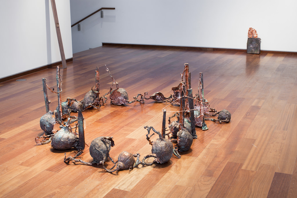 A series of squashes, vines and garden stakes, along with snails and a single coat hanger, are cast in copper foil using a repoussé method. The objects are removed from the cast, leaving a hollow form with torn edges. Though the sculpture appears as if an aggregate of objects, is a single unbroken piece of foil.