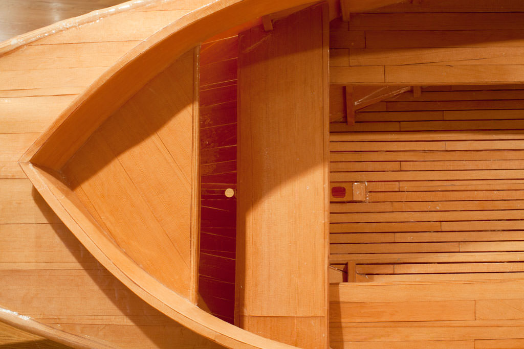 Rozinante is a hollow, single contiguous surface sculpture made from fir wood veneer sealed with resin, built at half-scale to L Francis Herreschoff’s 1951 plans for his famed yawl. Rozinante is made entirely of salvaged material from an earlier, now destroyed, veneer work entitled Thirty Foot Yawl (collapsible), which was made to the same Herreschoff plans, only at full scale.