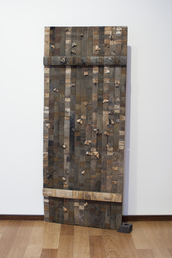 A veneer shell representing moths settled on a typical Scottish shed door. The veneer was cut from the face of the staves of casks that had previously contained wine, bourbon or madeira, used by Glenfiddich in the aging process to impart flavour to their whisky. In their gift shop, Glenfiddich sells items such as candleholders made from cask staves: this is our version of that.