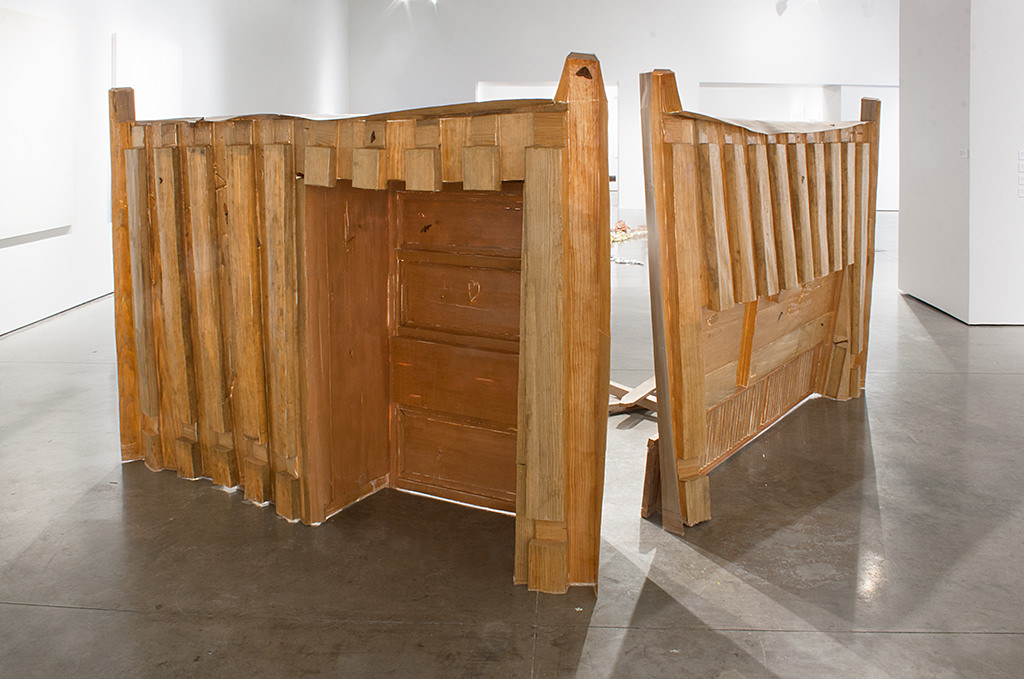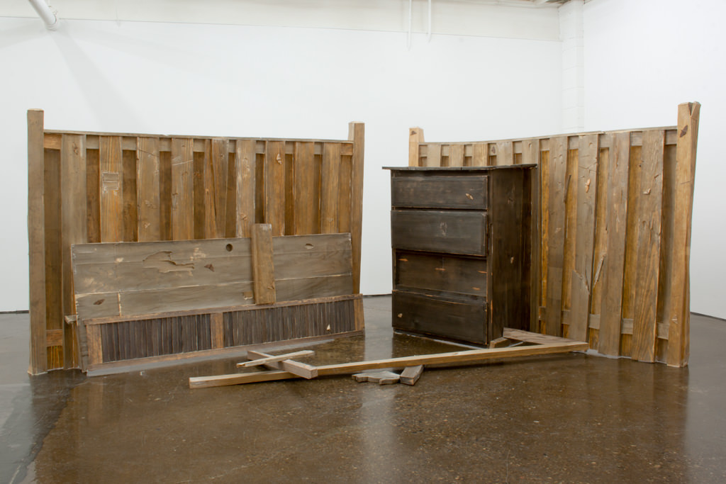 A relief sculpture as a self-supporting scrim, taking the form of a common type of baffled suburban fence. Representations of a cabinet, closet door panel, kicked in interior hollow-core door, and pieces of lumber are seamed in to the fence to prop it up. Cracks and other damage have likewise been inlaid into the surface, which is essentially a large piece of unsupported marquetry.