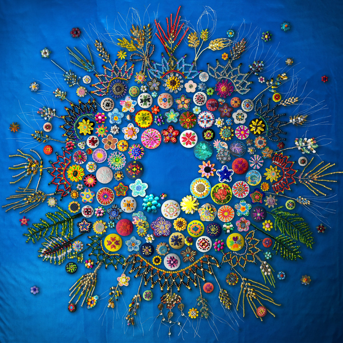 In a series of ten workshops held at the Brighton Beach, Brooklyn Heights, Coney Island, and Spring Creek branch libraries, over a hundred members of the public made beadwork, embroidery, and painted wood jewelry inspired by Ukrainian folk art. Each was photographed and composited into this digital wreath.