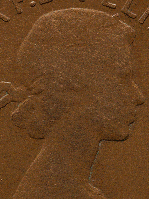 This looping video shows Queen Elizabeth II as portrayed on British coins during the course of her reign. One of each year's half pence or two pence coins are shown in order, in extreme close up. As the coins get older, more distressed and patinated, Elizabeth gets younger, and vice versa.