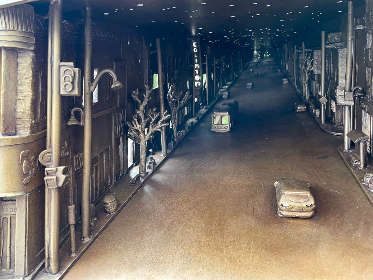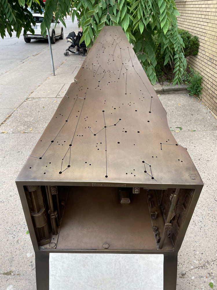 Capturing the constellations overhead, the bronze wedge viewing device invigorates a sculptural still, in the form of a bronze tourist marker. As the city changes around it, the streetscape inside the sculpture will remain still.